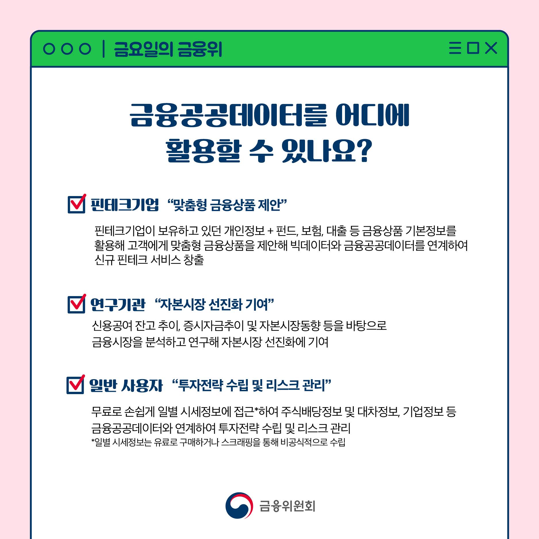 금융공공데이터틑 디지털 경제시대가 도ㅗ래함에 따라 공공부문 보유 정보의 적극적인 개방을 통해 일자리 창출 및 국민 실생활에 유용한 서비스 개발 등을 지원하기 위해 개방되었습니다.